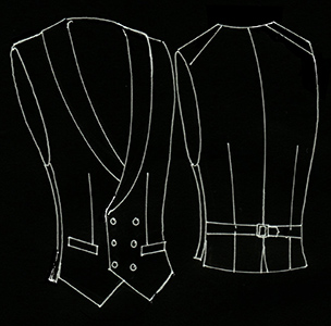 Meist besitzen diese Westen flache Schalrevers, sind mehr oder weniger ausgeschnitten und haben gerade oder eckige Saumkanten. Passende Hemden dazu haben einen hohen Steh- oder Umlegekragen, über die eine Fliege oder ein Plastron getragen wird.